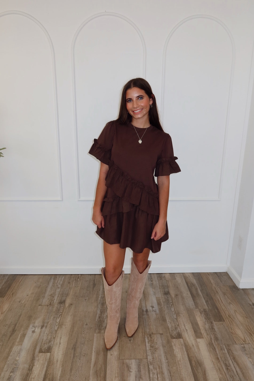 Twirl into autumn in this delightful brown mini dress, where playful ruffles add movement and charm to every step. Perfect for date nights, casual outings, or whenever you want to feel effortlessly put-together with a touch of whimsy. Dress it up with heels or keep it casual with sneakers—this versatile piece adapts to your mood.